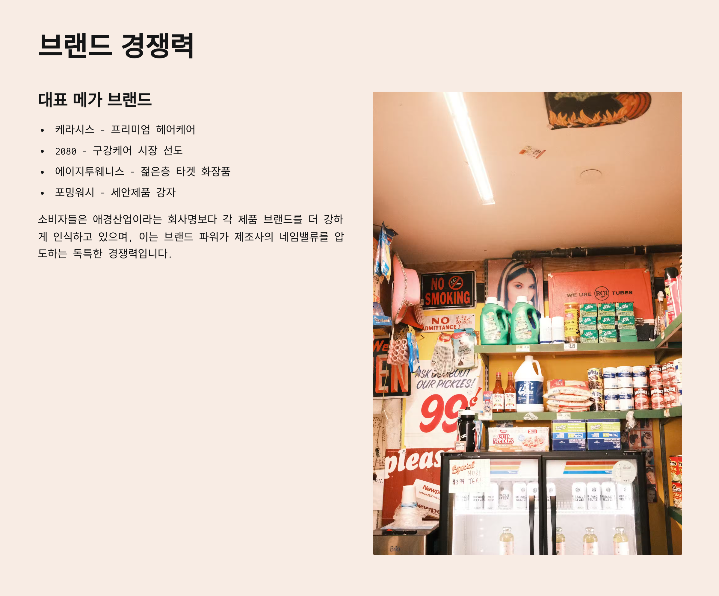 생활용품과 화장품을 제조·판매하는 기업으로, 국내외 다양한 브랜드를 보유하고 있습니다.