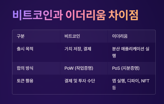 | 구분 | 비트코인 | 이더리움 |