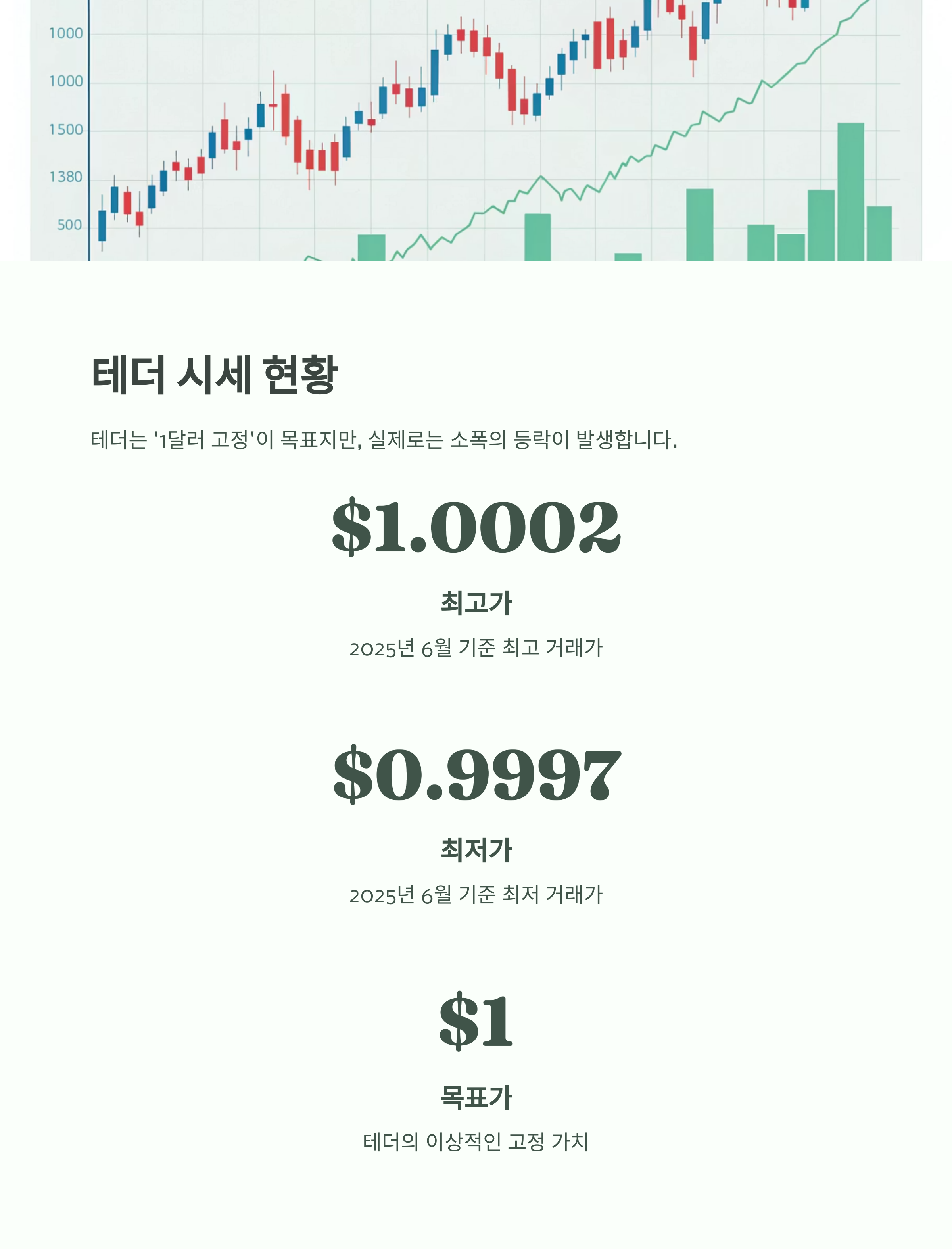 테더는 ‘1달러에 고정’된 스테이블코인이지만, 실제 시장에서는 소폭의 등락이 자주 발생합니다. 2025년 6월 현재, 테더는 대체로 $1.0002에서 $0.9997 사이에서 거래되며 안정적인 흐름을 보이고 있어요. 하지만 이 조용한 표면 아래엔 다양한 변동 요인이 숨어 있답니다.