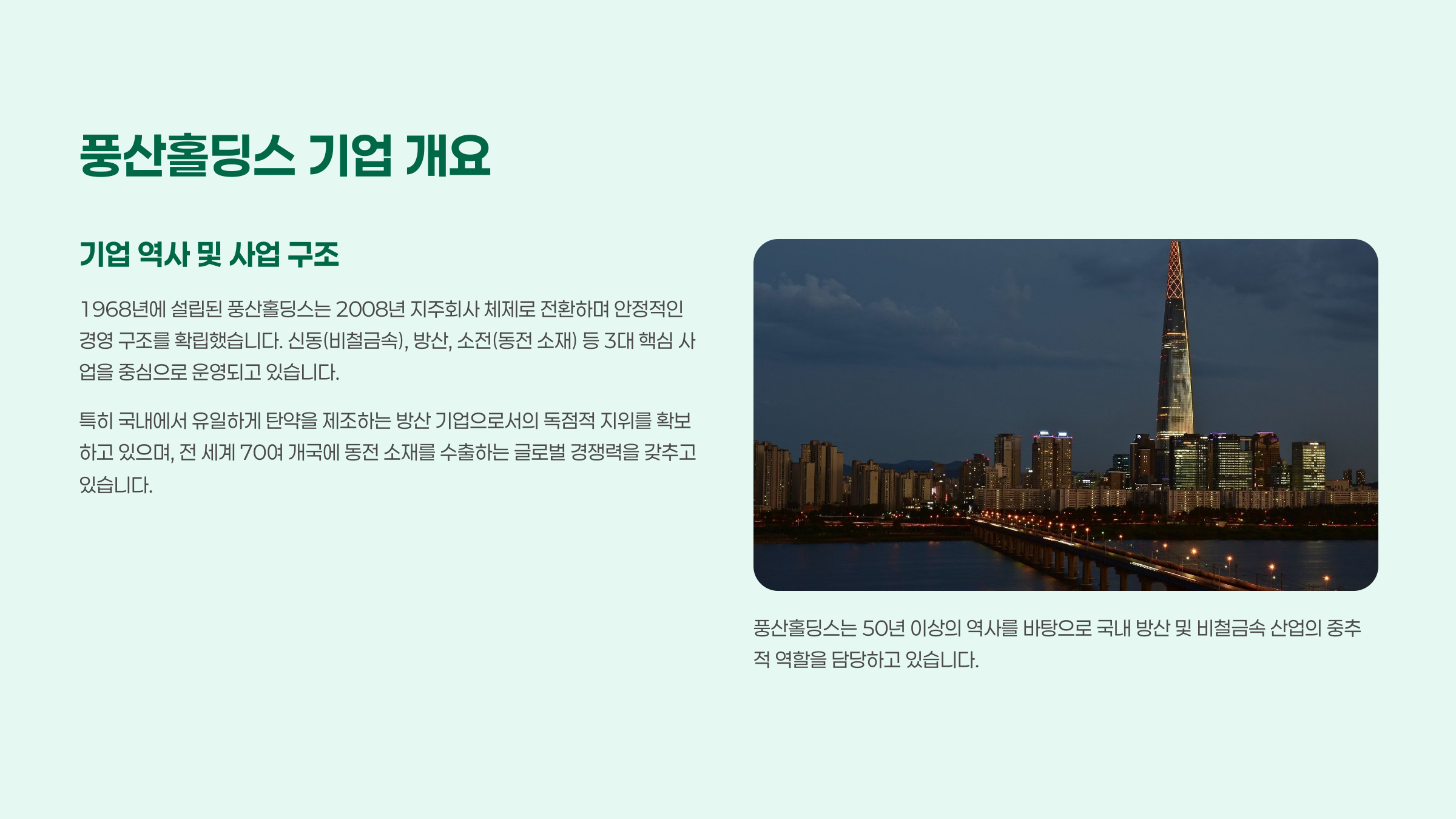 풍산홀딩스는 방위산업과 비철금속 산업을 중심으로 성장해온 대표적인 중견기업이에요. 이름에서 알 수 있듯이 ‘지주회사’ 구조를 갖추고 있어서, 주요 자회사를 통해 실질적인 사업을 운영하고 있죠. 방산 부문은 총탄, 탄피, 폭약 등 군수물자 중심이며, 비철금속 부문은 주로 동판재, 황동봉, 동합금 등을 생산합니다. 특히, 구리 가격과 국제 정세에 민감하게 반응하는 구조이기 때문에 투자 시 산업 전반에 대한 이해가 중요해요.