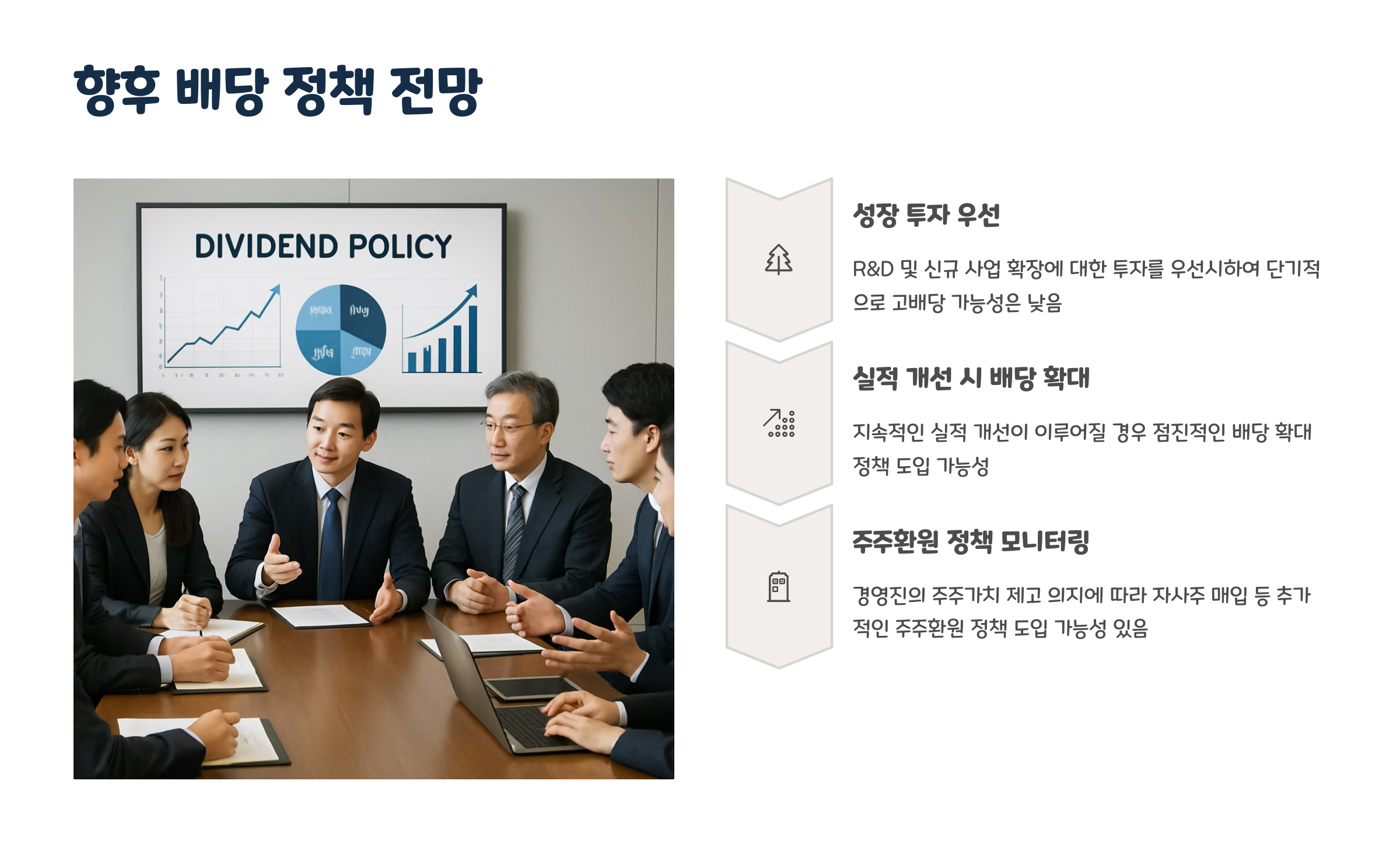 향후 배당을 원한다면 휴림로봇보다는 실적 기반이 안정적인 기업에 투자하는 것이 바람직합니다. 다만, 배당보다는 시세 차익 중심의 모멘텀 투자를 노린다면 고려할 수 있는 테마성 종목입니다.